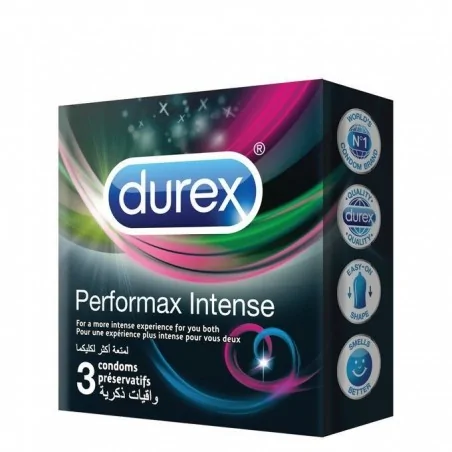 Durex Performax Intense est le premier préservatif Durex qui peut aider les couples à atteindre l’orgasme simultanément. Les stries et les picots amplifient les sensations et permettent à la femme de parvenir plus rapidement à l’orgasme. Le film de benzocaine dans l’extrémité du préservatif, permet de réduire les sensations et de retarder ainsi l’orgasme.