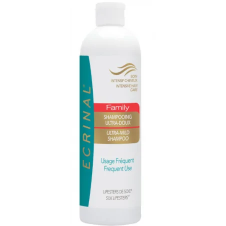 INDICATIONS Cheveux normaux, usages fréquents Enfants à partir de 3 ans PROPRIÉTÉS Le Shampooing Ultra Doux Family à l’ANP®2+ d’ECRINAL® restaure et maintient l’équilibre du cuir chevelu. Il assure brillance et vigueur aux cheveux. Sa douceur permet un usage fréquent. CONSEILS D’UTILISATION Appliquer sur cheveux mouillés 1 à 2 fois par jour. Faire mousser en massant le cuir chevelu. Rincer abondamment puis renouveler l’opération si nécessaire.