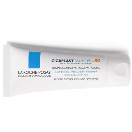Exposés aux UV quotidiens, les irritations superficielles (dont post-interventions dermatologiques) présentent un risque d’hyperpigmentation (marques pigmentaires rouge ou brune), et les tatouages récents ou anciens présentent un risque de dégradation (définition et couleur). INNOVATION ANTI-MARQUES CICAPLAST BAUME B5 spf 50, pour les peaux fragilisées exposées aux UV ou à risque de pigmentation. Convient aux peaux tatouées. Une action complète : Prévention des marques cicatricielles rouges et brunes [Haute protection UVA/UVB spf 50] + [ProceradTM, céramide breveté] Réparation épidermique de qualité : [Madécassoside] Apaisement, confort, anti-démangeaisons : [Panthénol à 5%]. La peau est réparée et apaisée. Protection anti-marques. CONSEILS D’UTILISATION : Appliquer sur une peau préalablement nettoyée et séchée. Précautions d’emploi : Ce produit n’est pas un produit solaire. En cas d’exposition intense ou prolongée, appliquer un produit de protection solaire adapté à votre type de peau et renouveler généreusement et fréquemment. Eviter les lèvres et le contour des yeux.