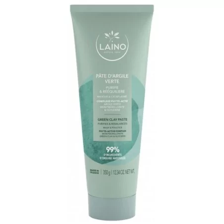 Laino a sélectionné l’Argile verte surfine Montmorillonite pour formuler la Pâte d’Argile Verte prête à l’emploi, à destination des peaux grasses. Elle est reconnue depuis l’Antiquité pour absorber l’excès de sébum, purifier et rééquilibrer l’épiderme par sa richesse en oligo-éléments et minéraux. Formule enrichie en glycérine. Plébiscitée par l’Observatoire des Cosmétiques, la Pâte d’Argile est la version prête à l’emploi de l’Argile Verte en poudre. La couleur de l’argile peut légèrement changer en fonction du filon d’extraction. CONSEILS D’UTILISATION Précautions : Avant toute première utilisation, il est recommandé de faire un essai sur votre avant bras 24h avant. En cas de rougeurs ou de sensation d’inconfort pendant l’application, rincer immédiatement. L’argile verte ne doit pas sécher, Il faut l’humidifier régulièrement d’eau à l’aide d’un coton. Utilisation en masque de beauté : appliquer la pâte en couche épaisse sur le visage en évitant le contour des yeux et des lèvres. Laisser agir pendant 5 min maximum en humidifiant régulièrement puis rincer abondamment à l’eau claire. Appliquer ensuite votre crème de jour habituelle. Bien respecter le temps de pose indiqué. Utilisation en cataplasme ou emplâtre : appliquer en couche d’1 à 2 cm sur la partie concernée et recouvrir d’un tissu. Laisser poser 1 à 2 heures et retirer avant que l’argile ne sèche.