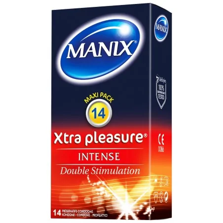 MANIX Xtra Pleasure Plaisir intense Souble stimulation Maxi Pack: 12 préservatifs. XTRA PLEASURE est le préservatif double stimulation pour le plaisir des deux partenaires. Sa texture nervurée et sa forme stimulante unique vous procureront des sensations de plaisir intense. – forme stimulante – texture nervurée – lubrifié – avec réservoir