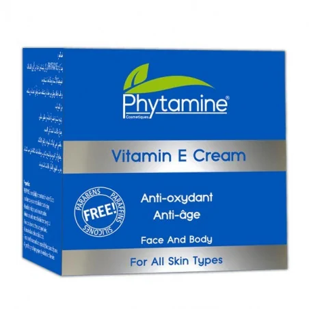 La crème PHYTAMINE fortement concentrée en vitamines E, agit à la fois en tant qu’un antioxidant et anti age . Nourrit en profondeur, et nettoie les impuretès. Hydrate et protège la peau contre le desséchement. Procure à la peau et bonne mine. Elimine les cernes et les taches sombres . Traite les vergetures et les taches des cicatrices , en particulier celles caussées par l’acné. Combat les signes de vieillissement (rides et ridicules).