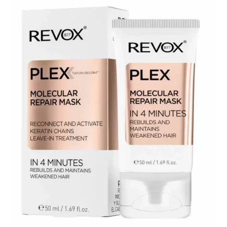 REVOX B77 PLEX MOLECULAR REPAIR MASK est une formule reconstructive innovante pour les cheveux, qui transforme l’apparence de chaque mèche, en inversant les effets des dommages. Les ingrédients puissants agissent pour réparer les liens de la kératine, qui peuvent être détruits par de nombreux processus chimiques et physiques tels que la décoloration, la teinture, le coiffage au fer et la permanente. Ce masque fournit tout ce qui est vital pour des cheveux sains, forts et brillants. La kératine et les peptides contenus dans la formule aident à lisser et à renforcer les cheveux et à les revitaliser au niveau structurel. La formule agit à l’intérieur des follicules pour reconnecter et activer les chaînes de kératine et laisser les cheveux avec une sensation de toucher soyeux. L’utilisation régulière du produit permet de retrouver la douceur et la brillance naturelles des cheveux et aide à protéger les cheveux contre les fourches. CONSEILS D’UTILISATION: Appliquer le masque sur la paume des mains et masser délicatement les cheveux humides ou secs, en évitant les racines. Ne pas rincer Si vous appliquez le produit après avoir lavé vos cheveux, évitez d’utiliser des après-shampooings ou des masques sous la douche, car ils scellent la surface des cheveux et le masque a plus de mal à pénétrer. INGREDIENTS: Water/ Aqua, Cetearyl Alcohol, Propylene Glycol, Alcohol Denat., Glycerin, Provitamin B5/ Panthenol, Trehalose, Caprylyl Glycol, Ethylhexylglycerin, Biotinoyl Tripeptide-1, Behentrimonium Chloride, Macadamia Ternifolia Seed Oil, Jojoba Seed Oil / Simmondsia Chinensis Seed Oil, Polysorbate 20, Dimethicone, Phenoxyethanol, Sh-Oligopeptide-78, Hydrolyzed Wheat Protein, Vitamin E Acetate/ Tocopheryl Acetate, Fragrance/ Parfum, Butylated Hydroxytoluene/ BHT.
