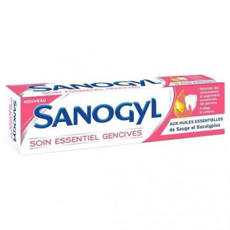 Sanogyl Dentifrice Soin Essentiel Gencives (tube 75ml) AUX HUILES ESSENTIELLES DE SAUGE ET D’EUCALYPTUS : *Sa formule aux Huiles Essentielles de Sauge et Eucalyptus, aux vertus thérapeutiques apaisantes et anti-inflammatoires, associées au citrate de Zinc, aide à lutter contre la plaque dentaire pouvant être à l’origine de l’inflammation gingivale occasionnelle, *Force antibactérienne longue durée : *Grâce aux vertus antibactériennes des huiles essentielles, sa formule offre une protection complète de votre bouchez.