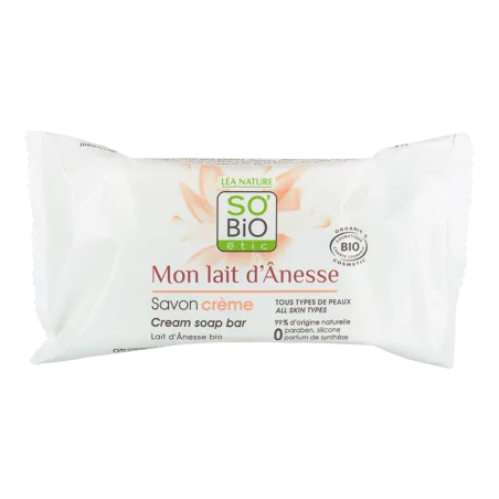 Nettoyer sa peau, matin et soir, est le premier geste de beauté indispensable. Afin d’allier douceur et toilette, SO’BiO étic® a créé le savon crème Mon lait d’ânesse®. Sa mousse fine et délicate enveloppe votre peau d’un voile parfumé, délicieusement lacté. Nettoyée, votre peau est prête pour les soins Mon lait d’ânesse®. Nettoie la peau 99% d’origine naturelle, 0 paraben, silicone, parfum de synthèse Savon de 100g