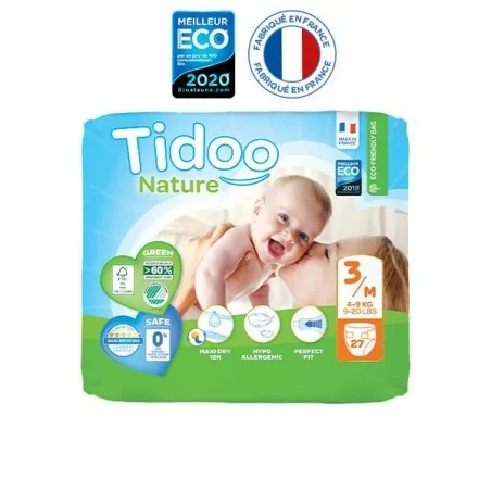 Les couches écologiques Tidoo Nature sont anti-fuites et hypoallergéniques. Fabrication française. Paquet de 27 couches T3 – M – 4-9kg. Tidoo Nature est une gamme de couches jetables anti-fuites, écologiques et fabriquées en France. Tidoo, la marque de couches élue Meilleur Produit Eco 2020 ! Engagée pour les bébés depuis 2013, Tidoo a littéralement conquis les parents des magasins Bio grâce à ses choix raisonnés pour offrir à bébé des couches avec un niveau de sécurité optimal, une efficacité sans faille, et un impact environnemental limité. Côté sécurité : les couches Tidoo sont certifiées non-irritantes et garanties sans lotion, latex, parfum… La cellulose naturelle mise en œuvre dans le matelas est blanchie, c’est-à-dire nettoyée de ses impuretés, grâce à un procédé à l’eau et à l’oxygène : la cellulose de ses couches est donc totalement dépourvue de chlore. Le voile externe est micro-perforé afin de laisser la peau de bébé respirer et réduire ainsi le risque d’irritation de la peau. Depuis sa création, Tidoo fait régulièrement analyser ses couches par un laboratoire indépendant pour contrôler l’absence de plus de 200 substances nocives. Côté efficacité : dotées de double barrières latérales et d’un coussin ultra absorbant, bébé est protégé de jour comme de nuit jusqu’à 12 heures. Côté écologie : Tidoo a fait le choix de fabriquer ses couches en France pour limiter son empreinte carbone et d’utiliser une cellulose certifiée issue de forêts gérées durablement, garantissant une gestion durable des forêts. Son sachet est composé à 80% de matière recyclée et est 100% recyclable. Ses engagements lui ont permis d’obtenir le très exigeant Ecolabel NORDIC SWAN qui valide une démarche responsable sur tout le cycle de vie du produit. Côté cœur : la marque soutient la très jolie association « Le Rire Médecin » en lui reversant chaque année une partie de son chiffre d’affaire. Cette contribution permet d’envoyer encore plus de clowns dans les hôpitaux pour égayer le quotidien des enfants malades. Les + produit : . Couches écologiques . Fabriquée en France . Anti-fuites et hypoallergéniques . 100% sans chlore, sans parfum, sans lotions, sans latex, sans OGM . Jusqu’à 12h anti-fuites