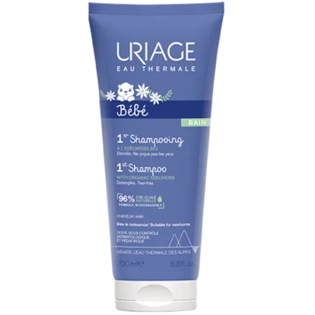 URIAGE BEBE Eau thermale 1er shampooing Extra-doux Ne pique pas les yeux, sans savon Cheveux 200ml Le 1er Shampooing laisse les cheveux de bébé brillants, doux et agréablement parfumés. Ne pique pas les yeux. Lave Ses agents nettoyants éliminent tout en douceur les impuretés du cuir chevelu et des cheveux. Démêle Grâce à ses agents démêlants, il évite les noeuds et facilite le démêlage. Respecte Sa formule haute tolérance et son pH physiologique respectent l’équilibre fragile du cuir chevelu. Conseils d’utilisation Appliquer sur les cheveux mouillés de bébé, masser légèrement, rincer abondamment à l’eau claire. Composition Formule INCI : Aqua (water), uriage thermal spring water, sodium cocoamphoacetate, sodium cocoyl glutamate, sodium chloride, caprylyl/capryl, glucoside, ceteareth-60 myristyl glycol, citric acid, parfum (fragrance), sodium benzoate, coco-glucoside, glyceryl oleate, polyquaternium-10, sodium acetate. Sans parabène. Hypoallergénique. Sans savon. PH physiologique.